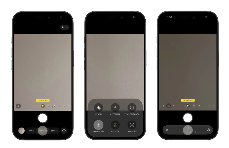 Toca sobre la palabra “Retrato” y después en “Exposición”. Ahora bájala hasta -1 o incluso un poco más. Dependerá de la luz de la habitación. Al oscurecer la imagen, eliminas reflejos innecesarios en la piel y creas sombras mucho más dramáticas.