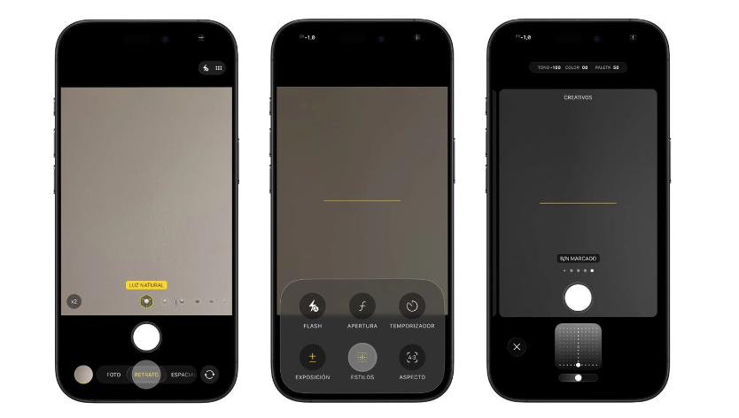 Vuelve a tocar sobre “Retrato” y escoge los estilos fotográficos o filtros. Dependerá de tu modelo de iPhone. Desplaza hasta la derecha del todo, donde encontrarás el blanco y negro marcado como mono. Verte en blanco y negro en la pantalla te ayuda a centrarte en la expresión y la luz, sin distraerte con los colores de la ropa o de la habitación.